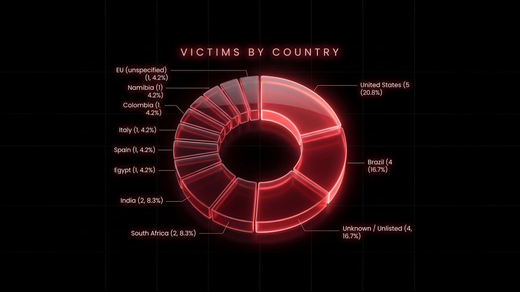The victim distribution shows a concentration across multiple regions, with the United States leading at 5 victims, followed by Brazil with 4. South Africa, India, and Egypt each account for 2 victims, reflecting a geographically diverse targeting pattern rather than a focus on a single region.