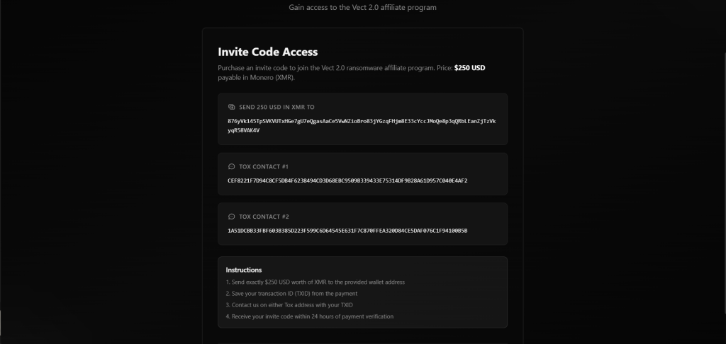The inclusion of a TOR (.onion) link within the post suggests the presence of a structured backend infrastructure, likely supporting affiliate onboarding, campaign management, and victim negotiations. Overall, the announcement reflects a standard but strategic approach to affiliate recruitment, aligning Vect with established RaaS operations that leverage underground forums to expand their reach and operational capacity.