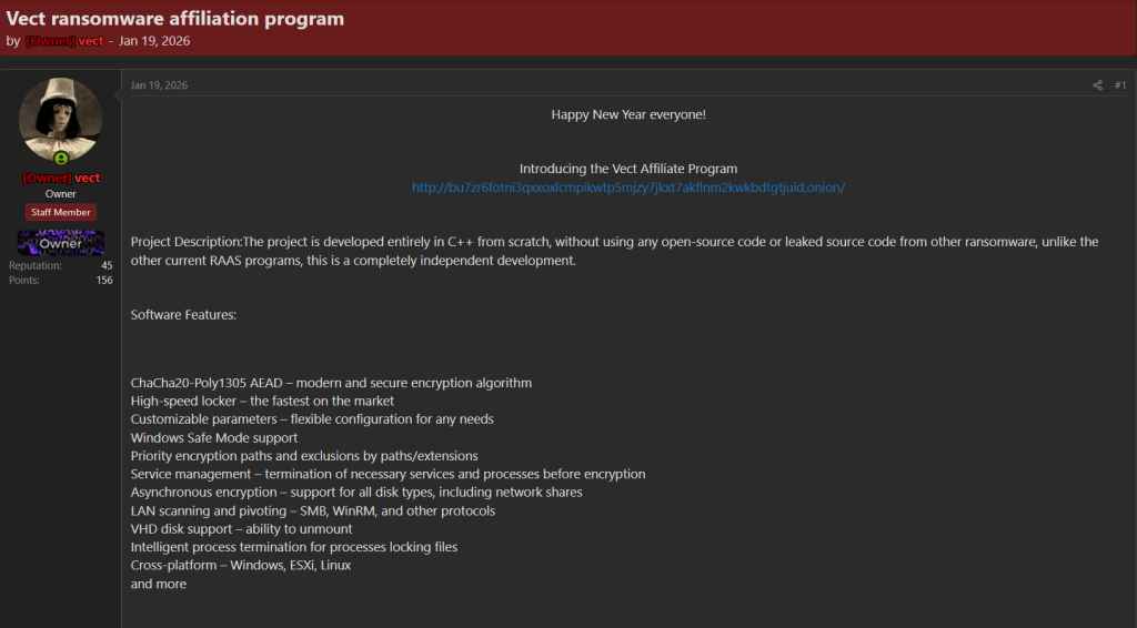 On January 19, 2026, the Vect ransomware operation publicly announced its affiliate program through a post on a Brechforums, marking a clear step toward scaling its ransomware-as-a-service (RaaS) model. The announcement was made by the actor behind the operation (“vect”), who used the platform to introduce the program and share access to a dedicated TOR-based panel.