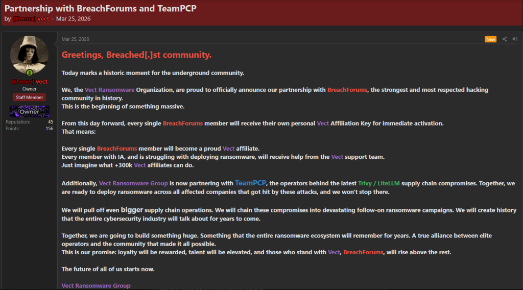 On March 25, 2026, the Vect ransomware operation published a new post on an underground forum announcing what it describes as a “partnership” with BreachForums and TeamPCP, signaling a more aggressive phase of expansion and ecosystem integration.