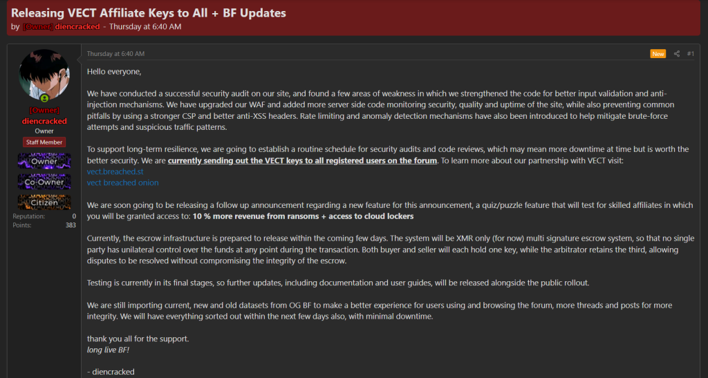 On March 2026, a BreachForums administrator (“diencracked”) announced the distribution of VECT affiliate keys to all registered users on the forum, reflecting a deeper level of integration between the ransomware operation and the platform.