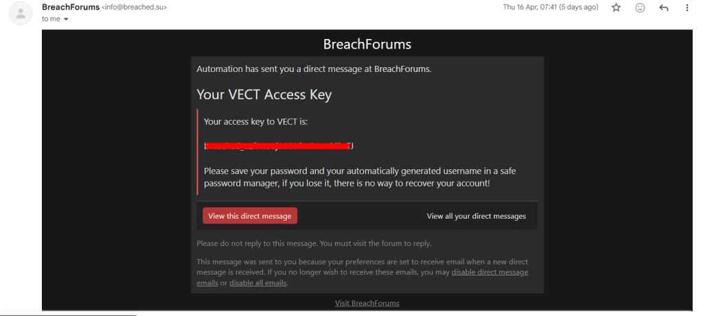 On April 16, 2026, BreachForums users started receiving automated emails containing their VECT access keys, marking the beginning of the actual distribution phase.