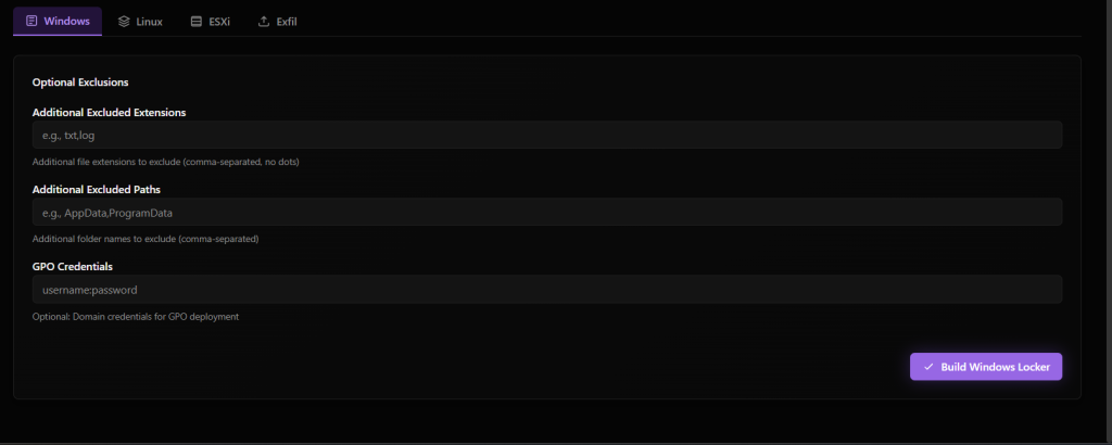 The builder capabilities include generating payloads for Windows, Linux, and ESXi, with additional configuration options such as defining excluded file extensions and paths, as well as handling GPO-related credentials. The panel also includes an option for an exfiltration tool, but it appears to be not yet released or still under development.