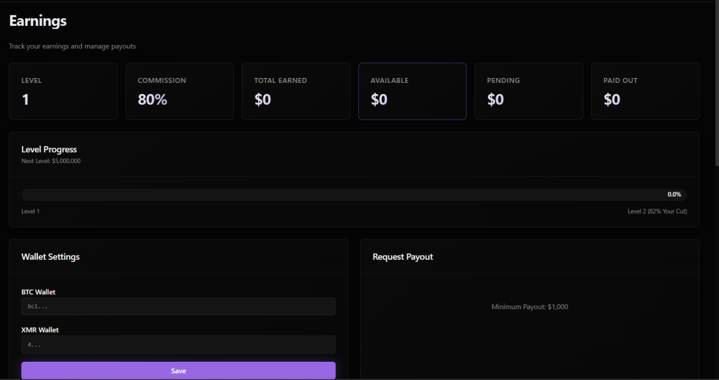 The panel also provides wallet configuration options, allowing affiliates to set BTC and XMR addresses for receiving payments, along with a payout request section that defines a minimum withdrawal amount of $1,000.