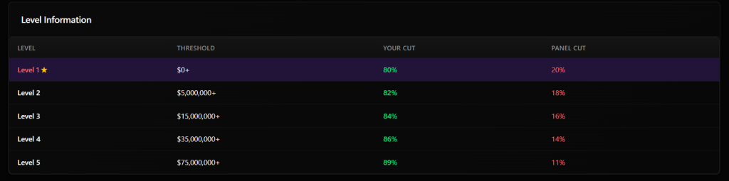 At the same time, the panel cut decreases as affiliates progress, dropping from 20% at Level 1 to 11% at the top tier. This structure incentivizes higher activity, rewarding affiliates with a larger share as they generate more revenue.