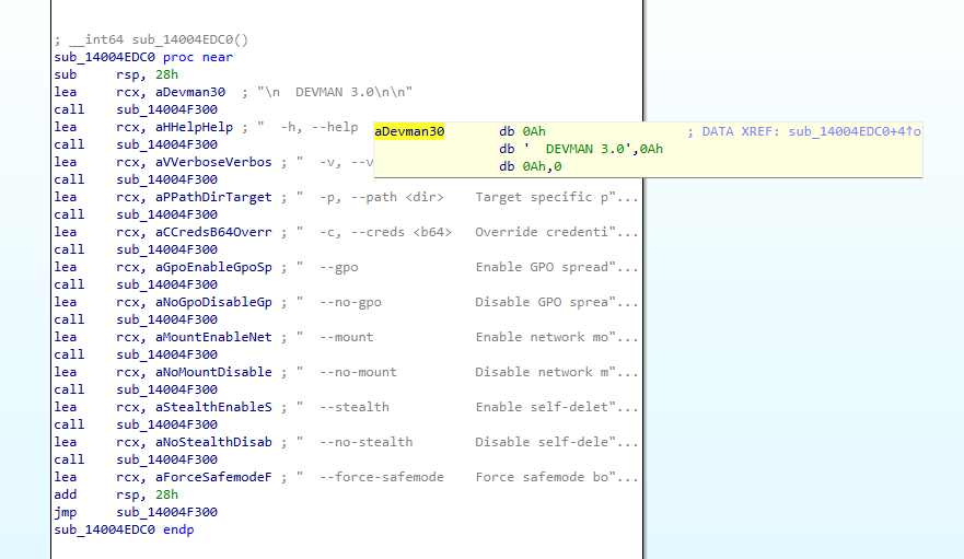 The binary contains multiple remote-spread modules, but they are not part of the default encryption path. The controlling flag is --gpo: the associated .data bytes are zero by default, and vect_main enters the confirmed spread branch only when the operator enables that flag.