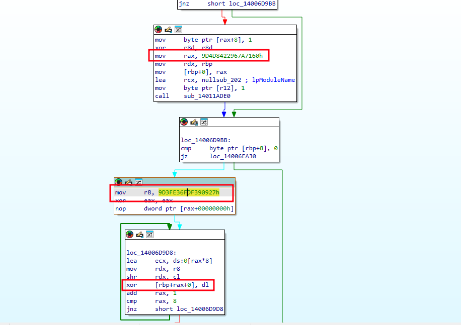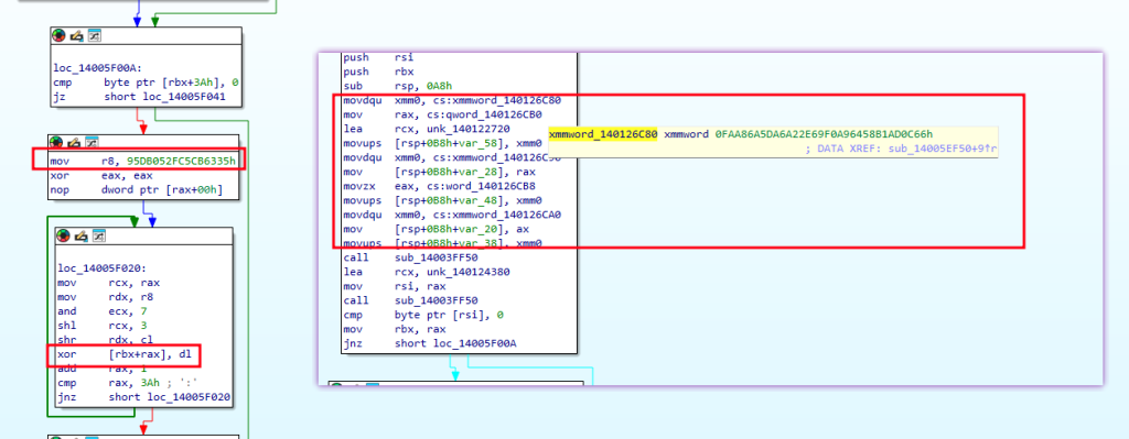 Every sensitive stringfile paths, registry keys, command lines, service names, process names, and network indicatorsis encrypted at rest using an 8-byte XOR scheme with per-string keys.