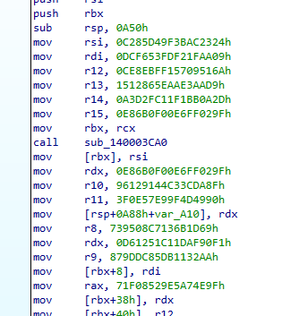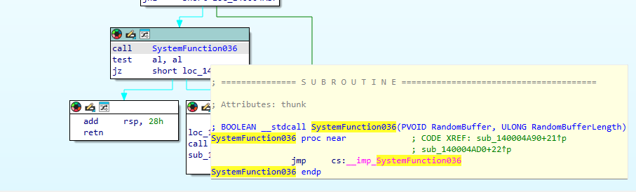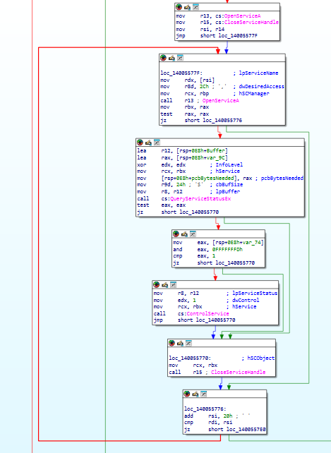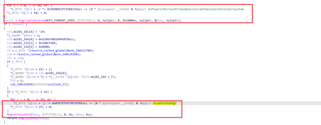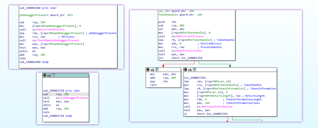 Both functions are called during the malware’s initialization phase. Additionally, a separate privilege escalation check uses OpenProcessToken + GetTokenInformation with TokenElevation to determine whether the process is running with administrative privilegesthis is not an anti-debug function, but rather gates access to operations requiring elevated permissions (service termination, shadow copy deletion, etc.).