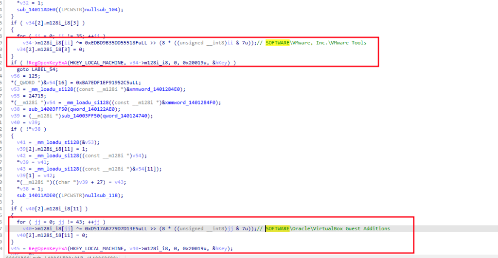 There are also VM detection functions that employs a file-based fingerprinting and decodes registry-based VM detection Keys