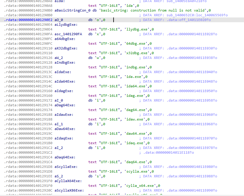 ollydbg.exe, x64dbg.exe, x32dbg.exe, windbg.exe, ida.exe, ida64.exe, idag.exe, idag64.exe, idaw.exe, idaw64.exe, idaq.exe, idaq64.exe, scylla.exe, scylla_x64.exe, scylla_x86.exe, protection_id.exe, x96dbg.exe, immunitydebugger.exe, ImportREC.exe, IMMUNITYDEBUGGER.EXE, MegaDumper.exe, reshacker.exe, processhacker.exe, procexp.exe, procexp64.exe, procmon.exe, procmon64.exe, autoruns.exe, autorunsc.exe, filemon.exe, regmon.exe, idaq64.exe, wireshark.exe, dumpcap.exe, hookexplorer.exe, ImportREC.exe, PETools.exe, LordPE.exe, SysInspector.exe, proc_analyzer.exe, sysAnalyzer.exe, sniff_hit.exe, joeboxcontrol.exe, joeboxserver.exe, ResourceHacker.exe, fiddler.exe, httpdebugger.exeBut actually, during dynamic analysis, none of these functions were called, so either they are just placeholders or they require a specific condition to be triggered.