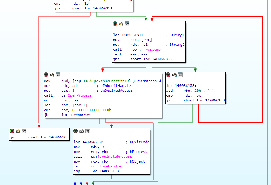 And there are also a separate function that scans running processes and checks each process name against an array of known analysis tool names