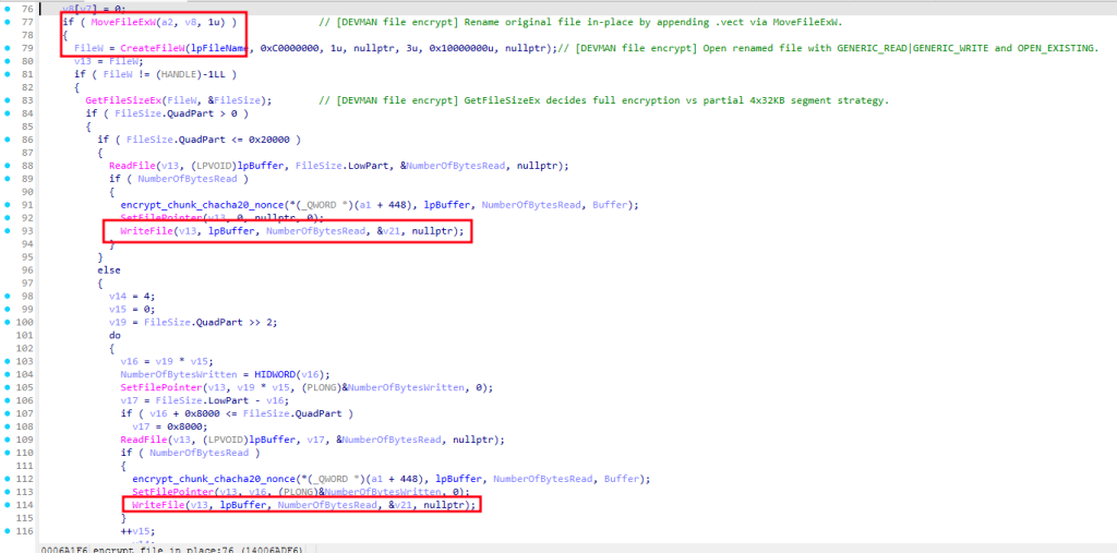 Its encryption design is weaker than the ransom note claims and confirms that, in this sample, large files are not fully recoverable from the .vect file alone. The file-encryption path uses a static 32-byte key, small files are fully recoverable from the .vect file, and large files are only partially recoverable because the binary preserves only the last nonce footer. No per-file key exchange or complete recovery metadata is stored in the file format.