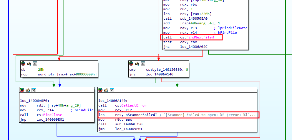 The scanner worker recursively enumerates directories with FindFirstFileW / FindNextFileW, applies directory and file filters, and queues eligible paths for encryption. It also drops ransom-note content in visited directories. Confirmed diagnostic strings include: