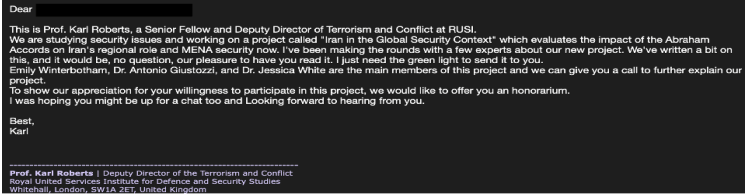 - Trust manipulation: Fake RUSI branding leverages credibility.