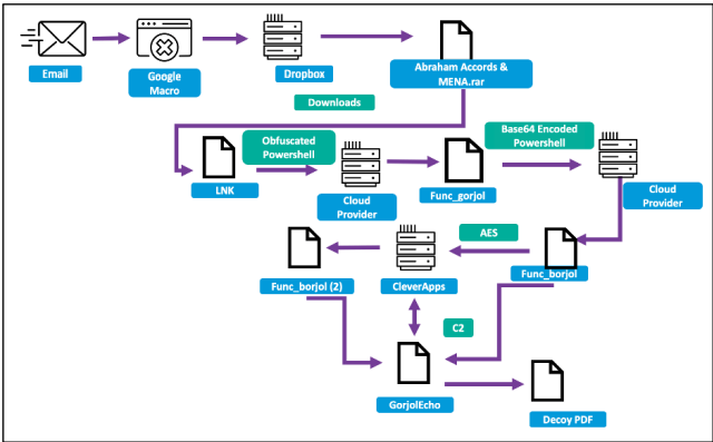 - Operators send a malicious link that hosts a Google Apps Script macro which immediately redirects the victim to a Dropbox URL.