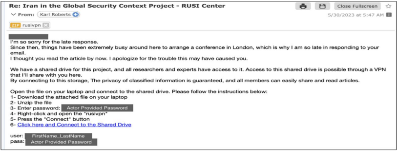 Between 2023 and 2024, APT35 markedly intensified its operations, adopting more sophisticated social-engineering tactics and multi-stage infection chains to compromise high-value targets. The group combined refined phishing lures with layered payload delivery (cloud hosted C2, password-protected archives, malicious LNKs, etc.) to increase stealth, persistence, and the ability to bypass modern defenses.