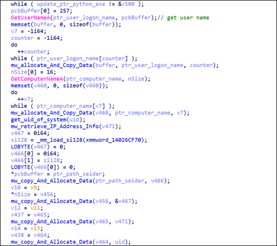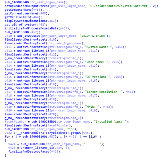 The malware also enumerates and collects a set of system information, storing the data in a text file at C:/seidr/output/system info.txt.