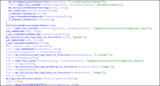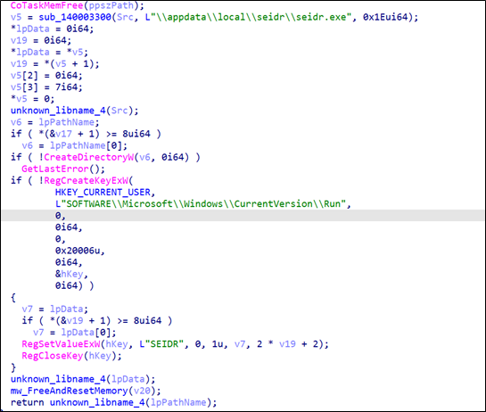 The malware employs a persistence mechanism to ensure its execution during system startup. Following the creation of a new path by appending ‘\appdata\local\seidr\seidr.exe’ to the source path, the code proceeds to create a corresponding directory, and then the malware attempts to create or open a registry key under