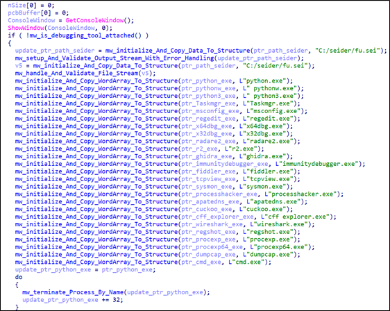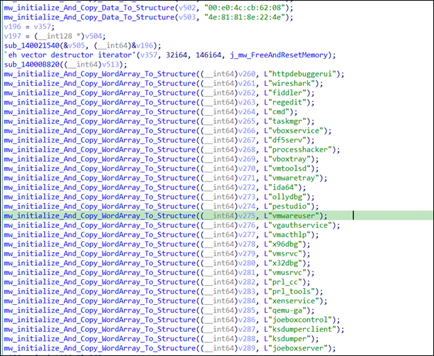 Seidr stealer also has a blacklist of IPs, MAC addresses, computer names, usernames, UIDs, and process names of analysis tools. This approach uses a blacklist that attackers use to evade security solutions to detect virtual machines and prevent the execution. If it finds a one element of these blacklists